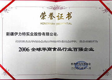 全國酒業文化萬里行組委會、中國酒文化百強企業評選委員會授予伊力特實業股份有限公司“2006年中國酒業文化百強企業”