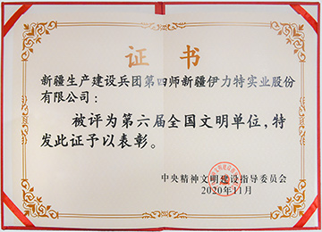 伊力特實業股份有限公司榮獲兵團精神文明建設指導委員會頒發的“1999—2000年兵團級文明單位”稱號