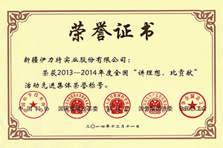 2014年-2018年獲得的成就 1、2014年12月新疆伊力特實業股份有限公司獲得中國科協、發展改革委、科技部、國資委、全國總工會聯合頒發的2013-2014年度全國講理想、比貢獻活動先進集體榮